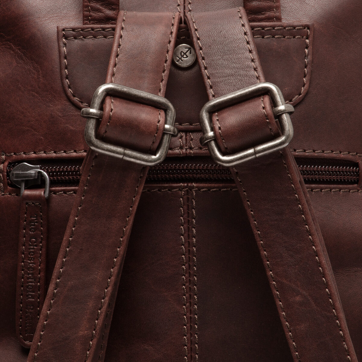 - logo The Chesterfield Brand vyražené v kůži na přední straně batohu